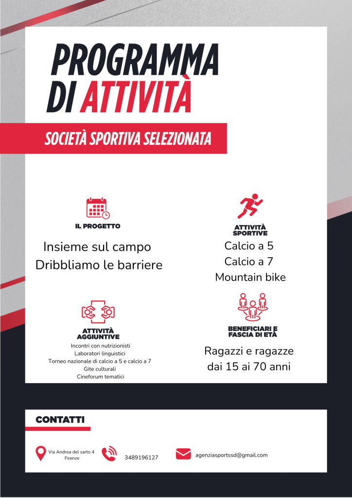 I beneficiari avranno la possibilità di partecipare a corsi di calcio a 11, basket e pallavolo presso gli impianti in gestione all’ Asd Sancat in Via del Mezzetta 1 e Via della Torre 27 a Firenze.