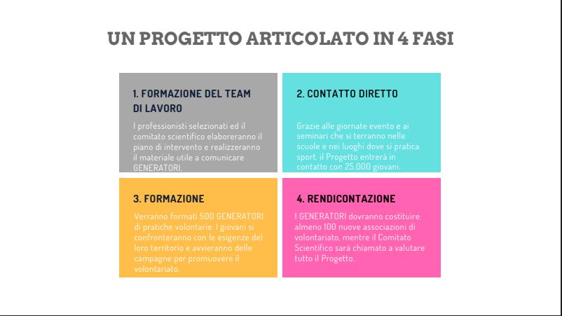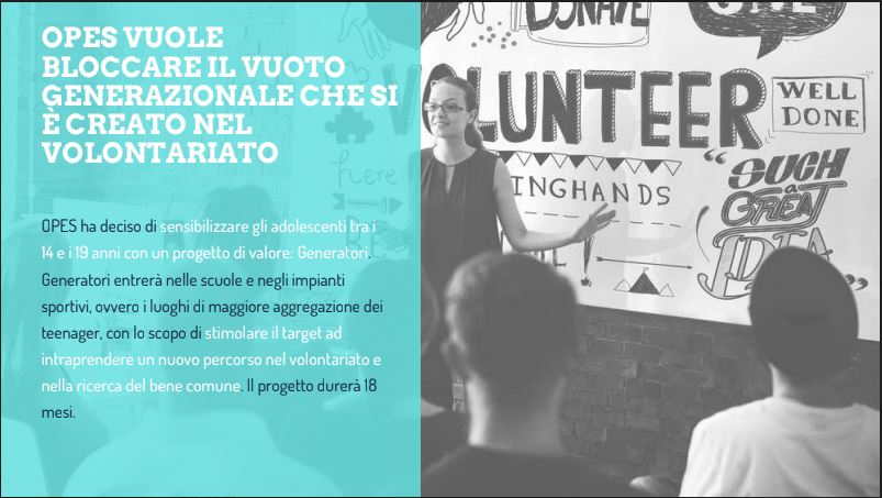 Con questa iniziativa OPES, da sempre attenta alle problematiche della società e in prima linea nel trasmettere alle nuove generazioni dei valori positivi, vuole sviluppare una cultura diffusa del volontariato, soprattutto tra i ragazzi di età compresa fra i 14 e i 19 anni. Per raggiungere questo obiettivo e per creare una società equa, pacifica ed inclusiva, il Progetto “Generatori” sarà attivato in tutte le Regioni d’Italia. In 24 città dello Stivale verranno coinvolti 24 Istituti secondari di secondo grado e 24 strutture sportive per un totale di 25 mila teenagers che entreranno in contatto con l’iniziativa. Da quei luoghi di aggregazione, dove i giovani trascorrono gran parte della loro giornata, emergeranno i 500 “Generatori” che accederanno ad una formazione extrascolastica di 20 ore e nasceranno 100 nuove organizzazioni di volontariato.